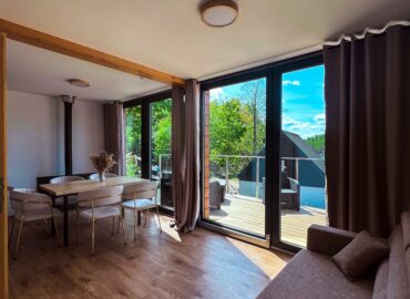 Domek Śnieżny posiada w pełni wyposażony, nieco większy niż w pozostałych domkach, aneks kuchenny, łazienkę oraz salon z rozkładaną, dwuosobową kanapą. Na górnej kondygnacji znajdują się dwie dwuosobowe sypialnie, w których łóżka mogą być ustawione jako podwójne (queen size) lub rozdzielone (twin). Prosimy o informację przy rezerwacji, jaki układ Państwo wybierają – pozwoli nam to przygotować dla Państwa najbardziej komfortowe warunki pobytu.